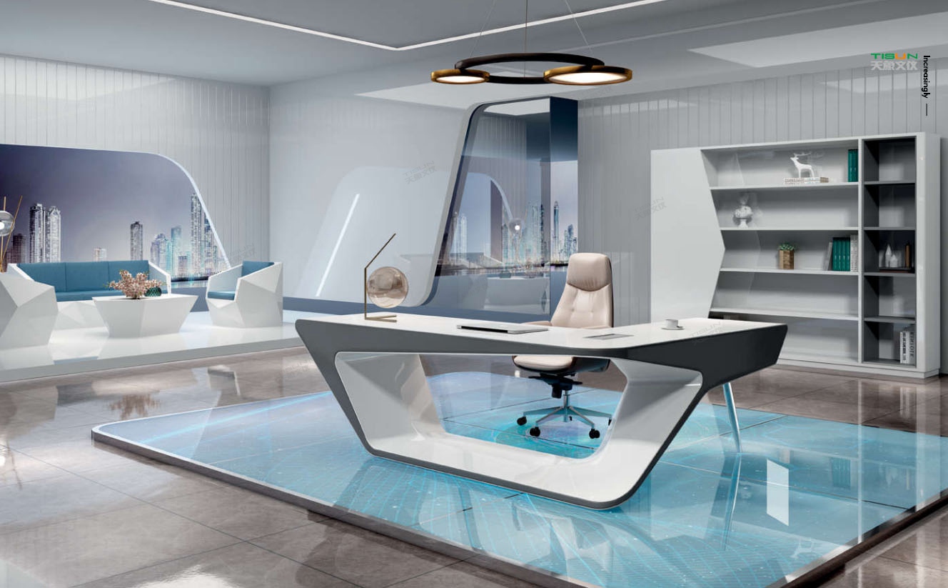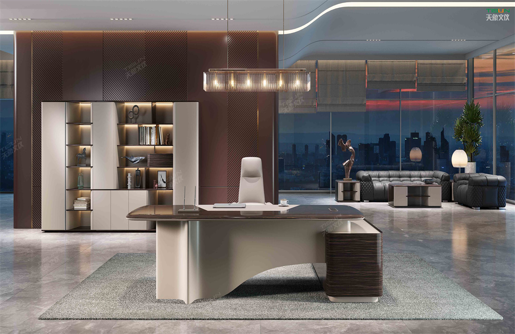 此款定制辦公家具大班臺打破傳統的做法,開闊創新,萃取傳統中式風格與現代風格之精華的相結合,打造出此款尊貴大氣的辦公桌,同時也為現代辦公環境注入了一股新的源泉。班臺大面積采用灰色超纖皮,提升辦公舒適度。細節提升品質,側邊柜增設開放存儲空間,邊柜內側CPU存放和收納功能并存,集收納與展示于一體,更能突顯主人具備現代的氣息。