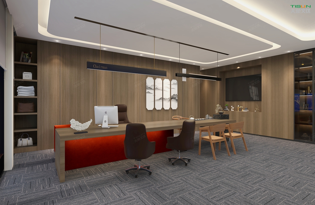 This office furniture is simple in shape, with a small number of turning lines to enrich the connotation of product design. It is matched with the overall customized background wall and bookcase to show the social status and identity of users with a sense of massiness.